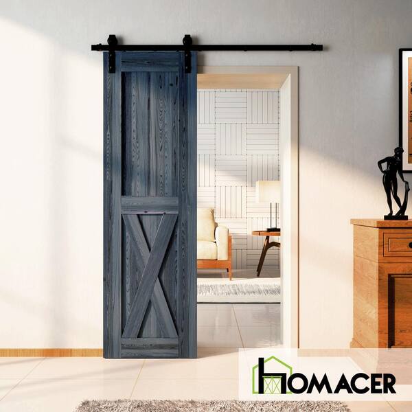 22 in. x 84 in. X-Frame Navy Solid Natural Pine Wood Panel Interior Sliding Barn Door Slab with Frame