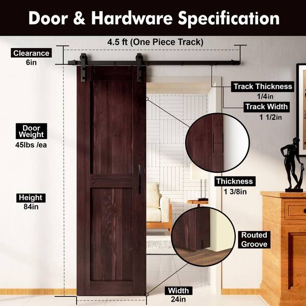 24 in. x 84 in. H-Frame Red Mahogany Solid Pine Wood Interior Sliding Barn Door with Hardware Kit Non-Bypass