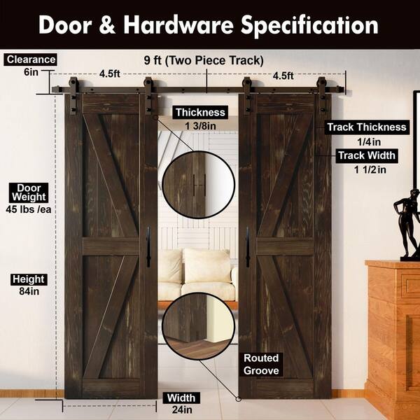 24 in. x 84 in. K-Frame Ebony Double Pine Wood Interior Sliding Barn Door with Hardware Kit Non-Bypass