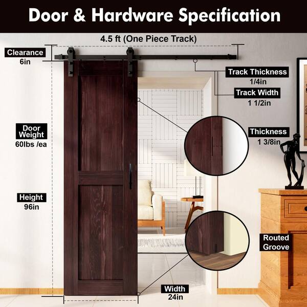 24 in. x 96 in. H-Frame Red Mahogany Solid Pine Wood Interior Sliding Barn Door with Hardware Kit, Non-Bypass