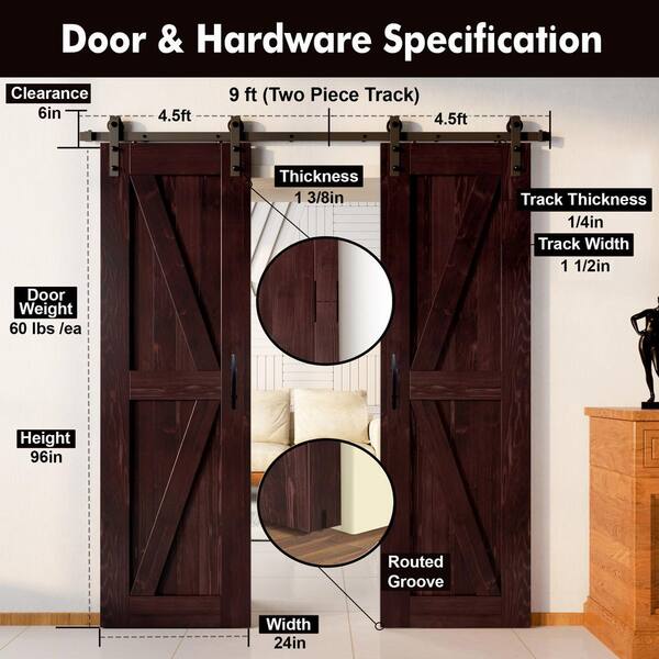 24 in. x 96 in. K-Frame Red Mahogany Double Pine Wood Interior Sliding Barn Door with Hardware Kit, Non-Bypass