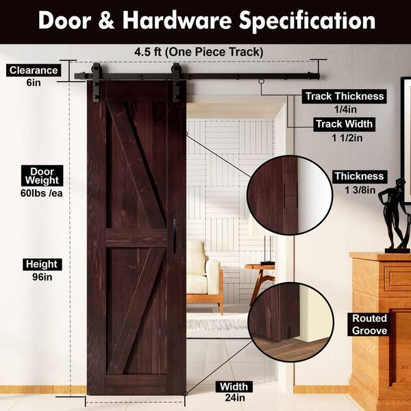 24 in. x 96 in. K-Frame Red Mahogany Solid Pine Wood Interior Sliding Barn Door with Hardware Kit, Non-Bypass