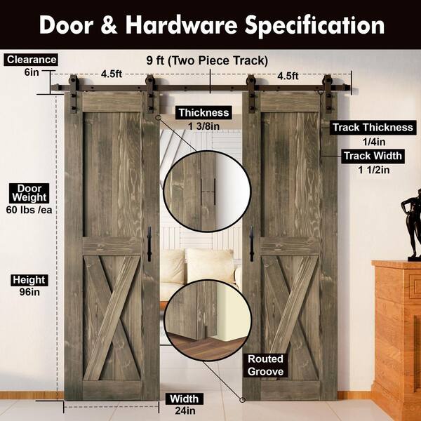 24 in. x 96 in. X-Frame Classic Gray Double Pine Wood Interior Sliding Barn Door with Hardware Kit, Non-Bypass