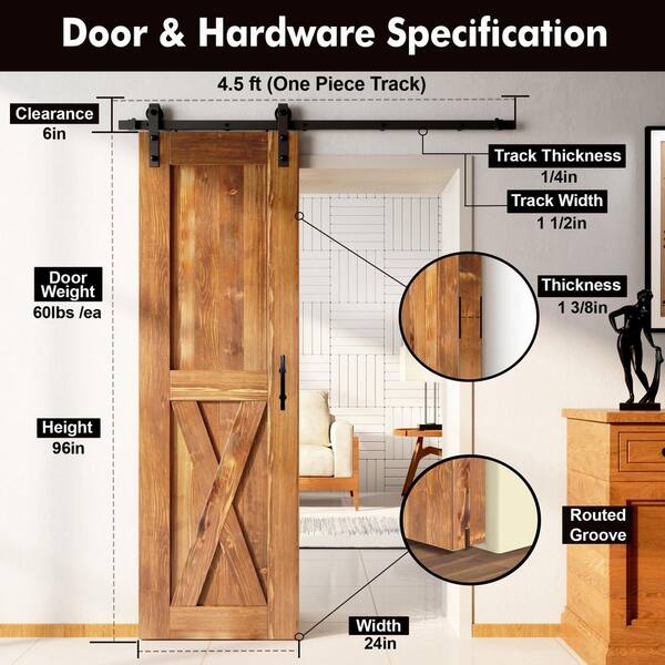 24 in. x 96 in. X-Frame Early American Solid Pine Wood Interior Sliding Barn Door with Hardware Kit, Non-Bypass