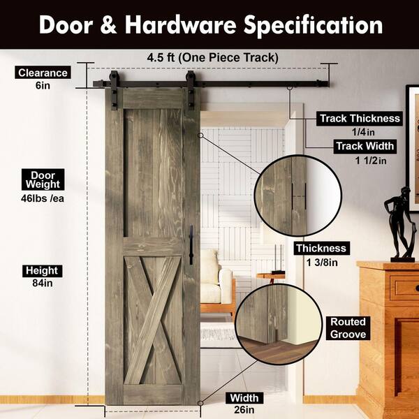 26 in. x 84 in. X-Frame Classic Gray Solid Pine Wood Interior Sliding Barn Door with Hardware Kit, Non-Bypass