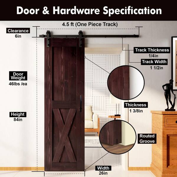 26 in. x 84 in. X-Frame Red Mahogany Solid Pine Wood Interior Sliding Barn Door with Hardware Kit, Non-Bypass