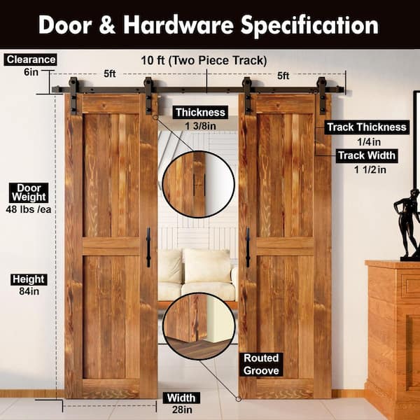 28 in. x 84 in. H-Frame Early American Double Pine Wood Interior Sliding Barn Door with Hardware Kit Non-Bypass