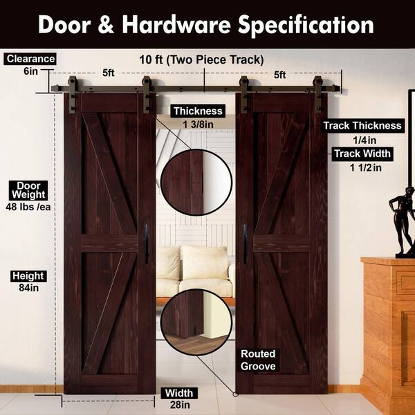 28 in. x 84 in. K-Frame Red Mahogany Double Pine Wood Interior Sliding Barn Door with Hardware Kit Non-Bypass
