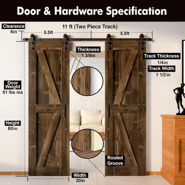 30 in. x 80 in. 5-in-1 Design Walnut Double Pine Wood Interior Sliding Barn Door with Hardware Kit, Non-Bypass