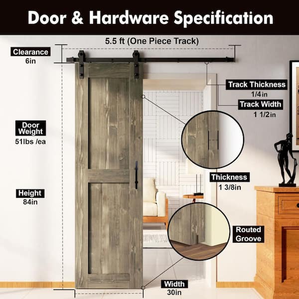 30 in. x 84 in. H-Frame Classic Gray Solid Pine Wood Interior Sliding Barn Door with Hardware Kit Non-Bypass