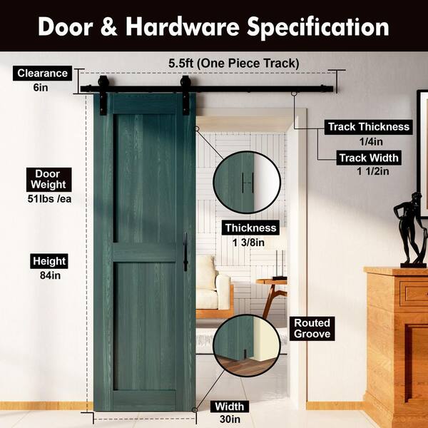 30 in. x 84 in. H-Frame Royal Pine Solid Pine Wood Interior Sliding Barn Door with Hardware Kit Non-Bypass