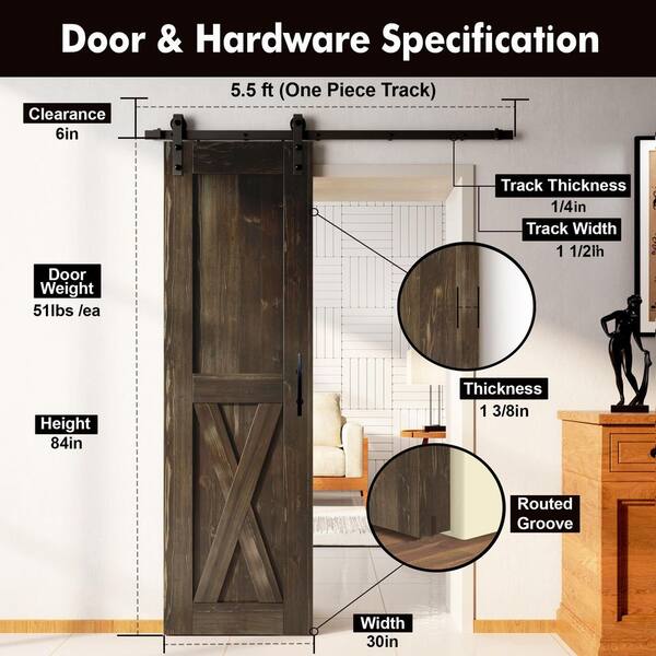 30 in. x 84 in. X-Frame Ebony Solid Pine Wood Interior Sliding Barn Door with Hardware Kit, Non-Bypass