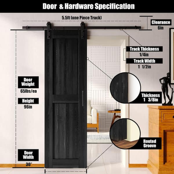 30 in. x 96 in. H-Frame Black Solid Pine Wood Interior Sliding Barn Door with Hardware Kit, Non-Bypass