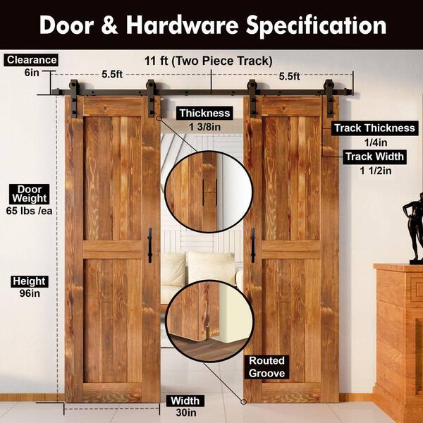 30 in. x 96 in. H-Frame Early American Double Pine Wood Interior Sliding Barn Door with Hardware Kit, Non-Bypass