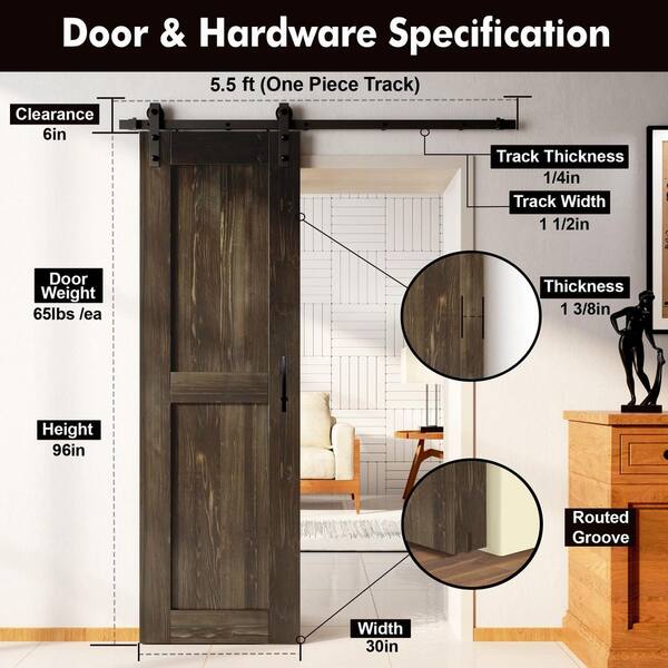 30 in. x 96 in. H-Frame Ebony Solid Pine Wood Interior Sliding Barn Door with Hardware Kit, Non-Bypass