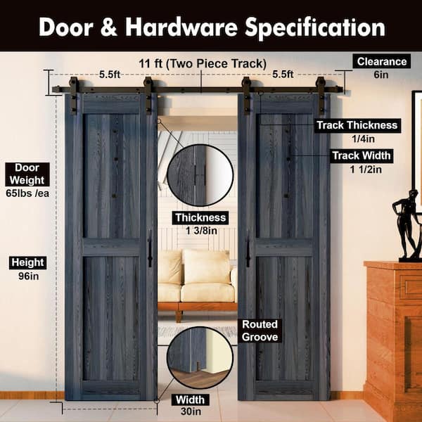 30 in. x 96 in. H-Frame Navy Double Pine Wood Interior Sliding Barn Door with Hardware Kit, Non-Bypass