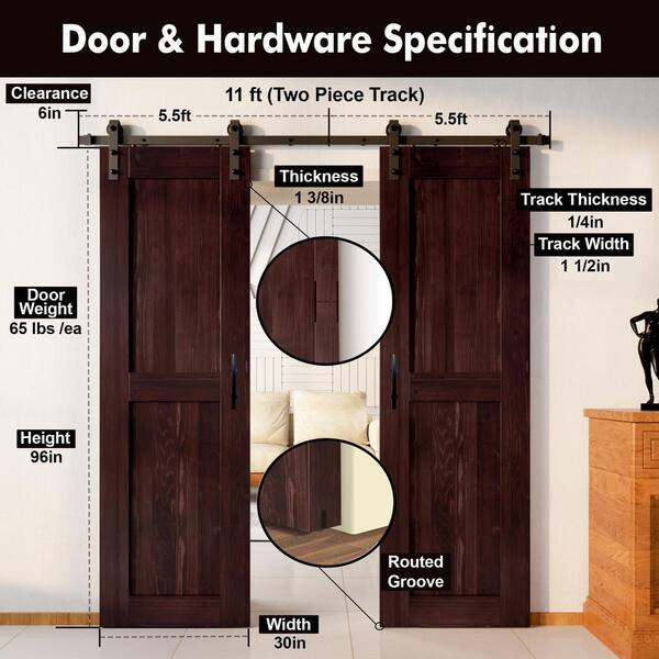 30 in. x 96 in. H-Frame Red Mahogany Double Pine Wood Interior Sliding Barn Door with Hardware Kit, Non-Bypass