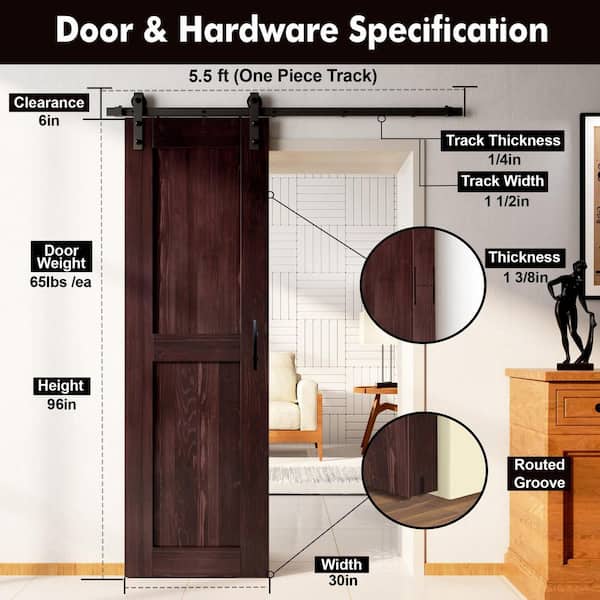30 in. x 96 in. H-Frame Red Mahogany Solid Pine Wood Interior Sliding Barn Door with Hardware Kit, Non-Bypass