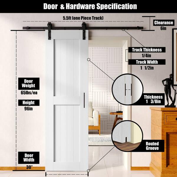 30 in. x 96 in. H-Frame White Solid Pine Wood Interior Sliding Barn Door with Hardware Kit, Non-Bypass