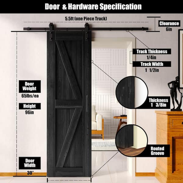 30 in. x 96 in. K-Frame Black Solid Pine Wood Interior Sliding Barn Door with Hardware Kit, Non-Bypass