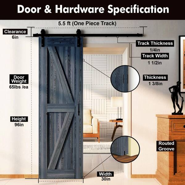 30 in. x 96 in. K-Frame Navy Solid Pine Wood Interior Sliding Barn Door with Hardware Kit, Non-Bypass