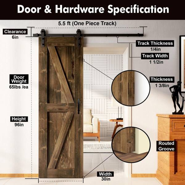 30 in. x 96 in. K-Frame Walnut Solid Pine Wood Interior Sliding Barn Door with Hardware Kit, Non-Bypass