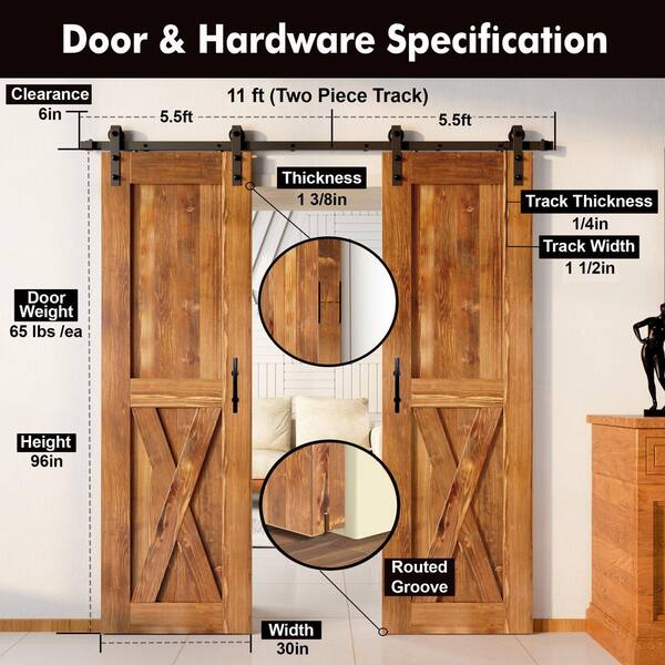 30 in. x 96 in. X-Frame Early American Double Pine Wood Interior Sliding Barn Door with Hardware Kit, Non-Bypass