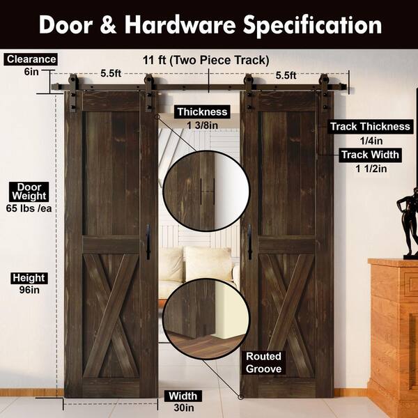 30 in. x 96 in. X-Frame Ebony Double Pine Wood Interior Sliding Barn Door with Hardware Kit, Non-Bypass