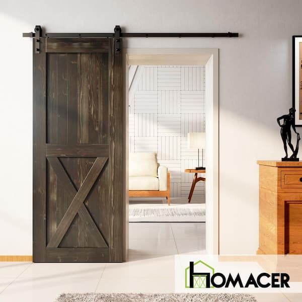 30 in. x 96 in. X-Frame Ebony Solid Natural Pine Wood Panel Interior Sliding Barn Door Slab with Frame