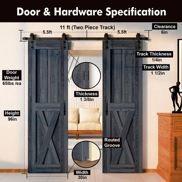 30 in. x 96 in. X-Frame Navy Double Pine Wood Interior Sliding Barn Door with Hardware Kit, Non-Bypass