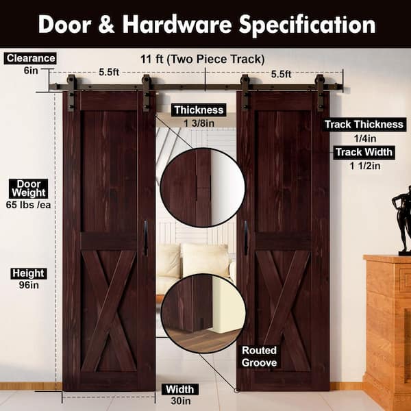 30 in. x 96 in. X-Frame Red Mahogany Double Pine Wood Interior Sliding Barn Door with Hardware Kit, Non-Bypass