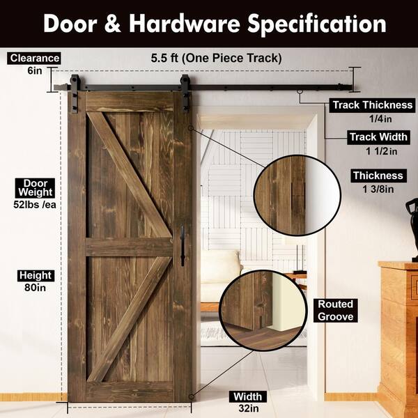 32 in. x 80 in. 5-in-1 Design Walnut Solid Pine Wood Interior Sliding Barn Door with Hardware Kit, Non-Bypass