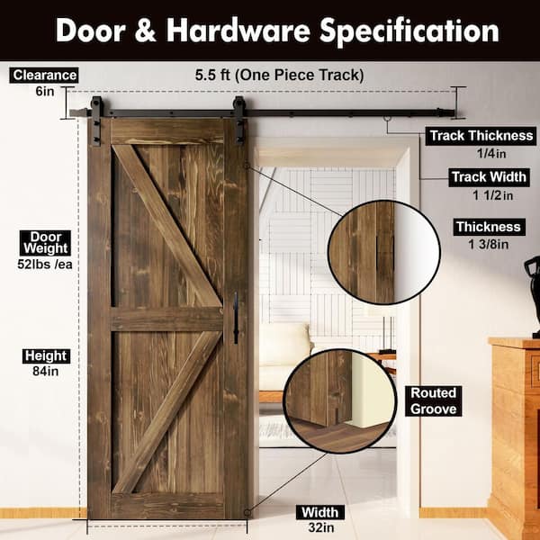 32 in. x 84 in. K-Frame Walnut Solid Pine Wood Interior Sliding Barn Door with Hardware Kit, Non-Bypass