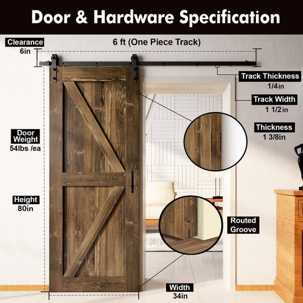 34 in. x 80 in. 5-in-1 Design Walnut Solid Pine Wood Interior Sliding Barn Door with Hardware Kit, Non-Bypass