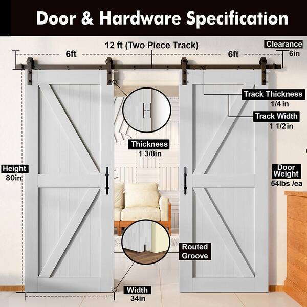 34 in. x 80 in. 5 in. 1 Design White Double Pine Wood Interior Sliding Barn Door Hardware Kit, Non-Bypass