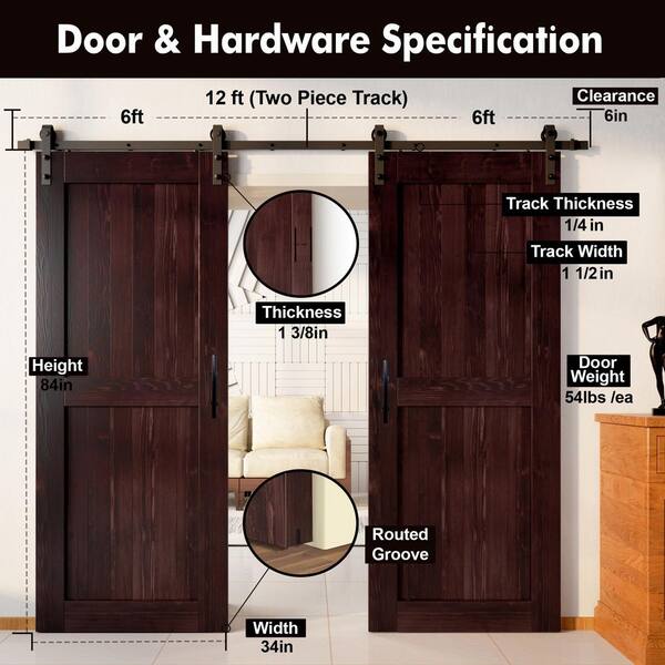 34 in. x 84 in. H-Frame Red Mahogany Double Pine Wood Interior Sliding Barn Door with Hardware Kit Non-Bypass