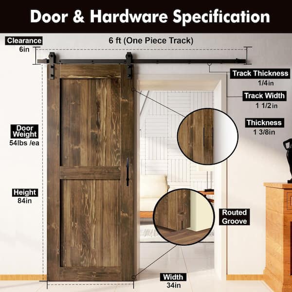 34 in. x 84 in. H-Frame Walnut Solid Pine Wood Interior Sliding Barn Door with Hardware Kit, Non-Bypass