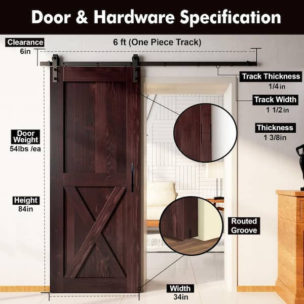 34 in. x 84 in. X-Frame Red Mahogany Solid Pine Wood Interior Sliding Barn Door with Hardware Kit, Non-Bypass