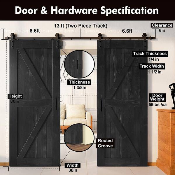 36 in. W. x 80 in. 5-in-1-Design Black Double Pine Wood Interior Sliding Barn Door with Hardware Kit, Non-Bypass