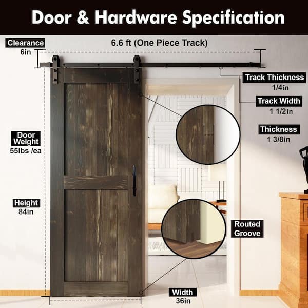 36 in. x 84 in. H-Frame Ebony Solid Pine Wood Interior Sliding Barn Door with Hardware Kit Non-Bypass