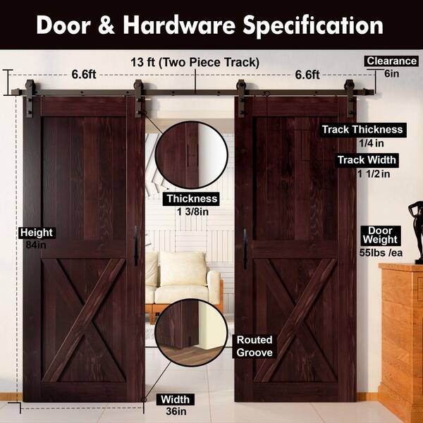 36 in. x 84 in. X-Frame Red Mahogany Double Pine Wood Interior Sliding Barn Door with Hardware Kit Non-Bypass