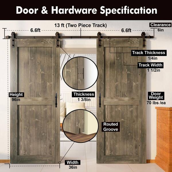 36 in. x 96 in. H-Frame Classic Gray Double Pine Wood Interior Sliding Barn Door with Hardware Kit, Non-Bypass