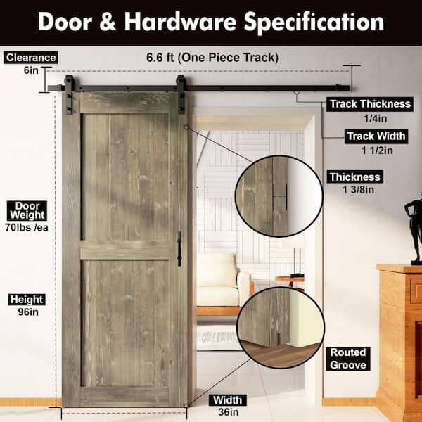 36 in. x 96 in. H-Frame Classic Gray Solid Pine Wood Interior Sliding Barn Door with Hardware Kit, Non-Bypass