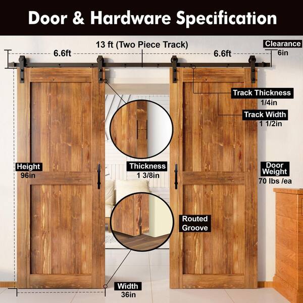 36 in. x 96 in. H-Frame Early American Double Pine Wood Interior Sliding Barn Door with Hardware Kit, Non-Bypass
