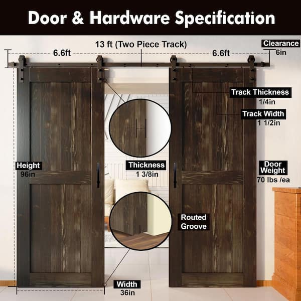 36 in. x 96 in. H-Frame Ebony Double Pine Wood Interior Sliding Barn Door with Hardware Kit, Non-Bypass