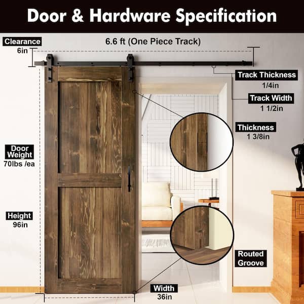 36 in. x 96 in. H-Frame Walnut Solid Pine Wood Interior Sliding Barn Door with Hardware Kit, Non-Bypass
