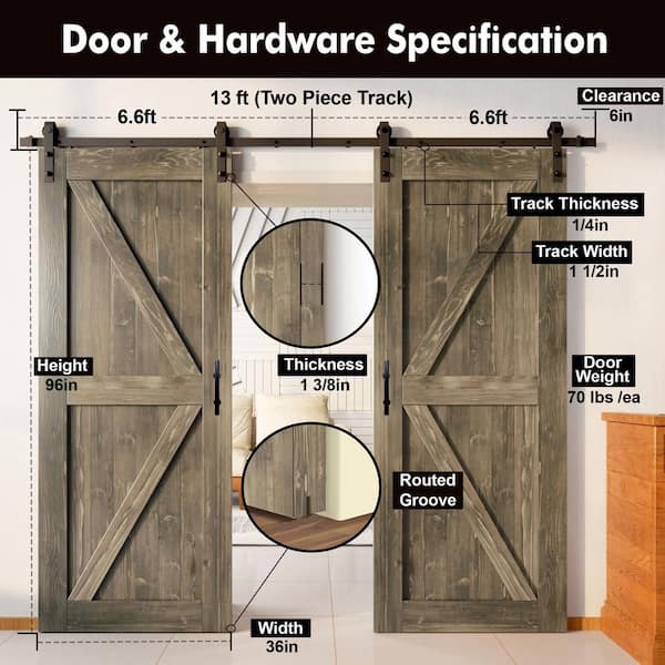 36 in. x 96 in. K-Frame Classic Gray Double Pine Wood Interior Sliding Barn Door with Hardware Kit, Non-Bypass