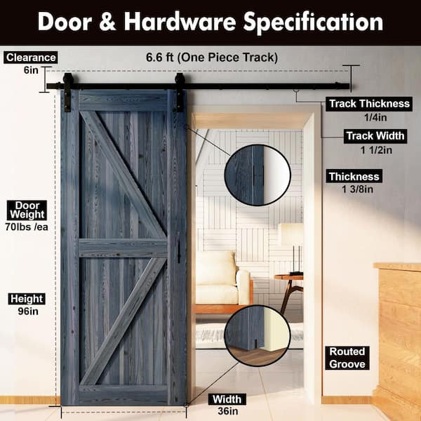 36 in. x 96 in. K-Frame Navy Solid Pine Wood Interior Sliding Barn Door with Hardware Kit, Non-Bypass