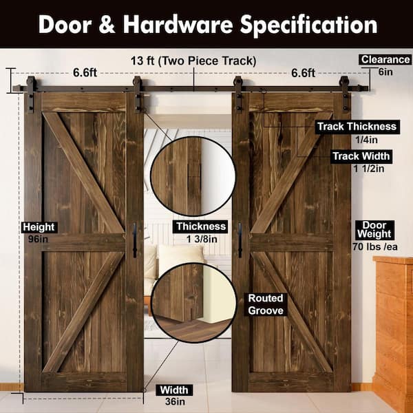 36 in. x 96 in. K-Frame Walnut Double Pine Wood Interior Sliding Barn Door with Hardware Kit, Non-Bypass