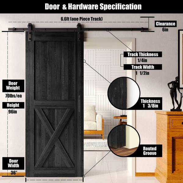 36 in. x 96 in. X-Frame Black Solid Pine Wood Interior Sliding Barn Door with Hardware Kit, Non-Bypass